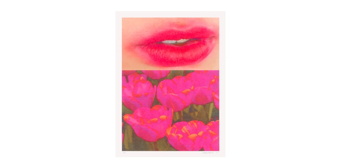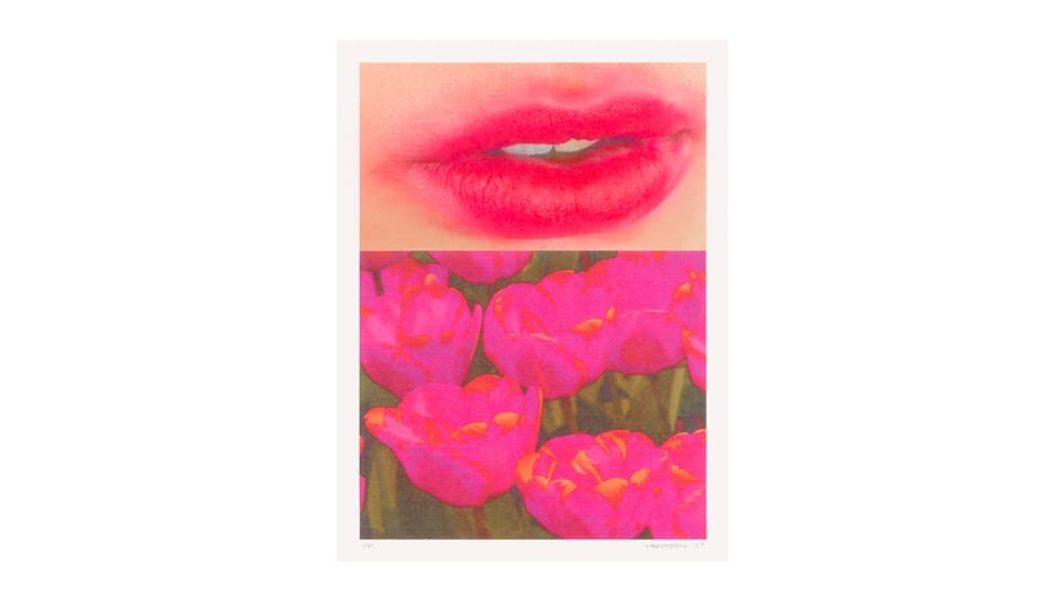 There is a cinematic quality to the images that Vanden Berge culls. He purposefully stacks opposing themes as a way to spark dialogues with disparate subject matter and spotlight the beauty in the everyday. His latest Untitled print features a field of pink tulips split between a cropped image of a women’s lips. The impermanence of beauty, emblematic of the use of flowers throughout art history, becomes a central exploration within the artwork, which Vanden Berge zooms in to deliberately abstract, allowing the viewer to piece their own interpretation.