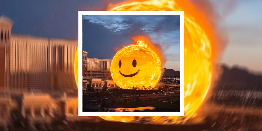 Looking closely at the surrounding cityscape on the cover, one may notice that the flaming orb is actually The Sphere, a new tourist attraction and music venue that opened last year in Las Vegas, Nevada. With this added context, Blake’s statement grows even more complex, perhaps unpacking how mass spectacles distract from urgent socio-political crises.