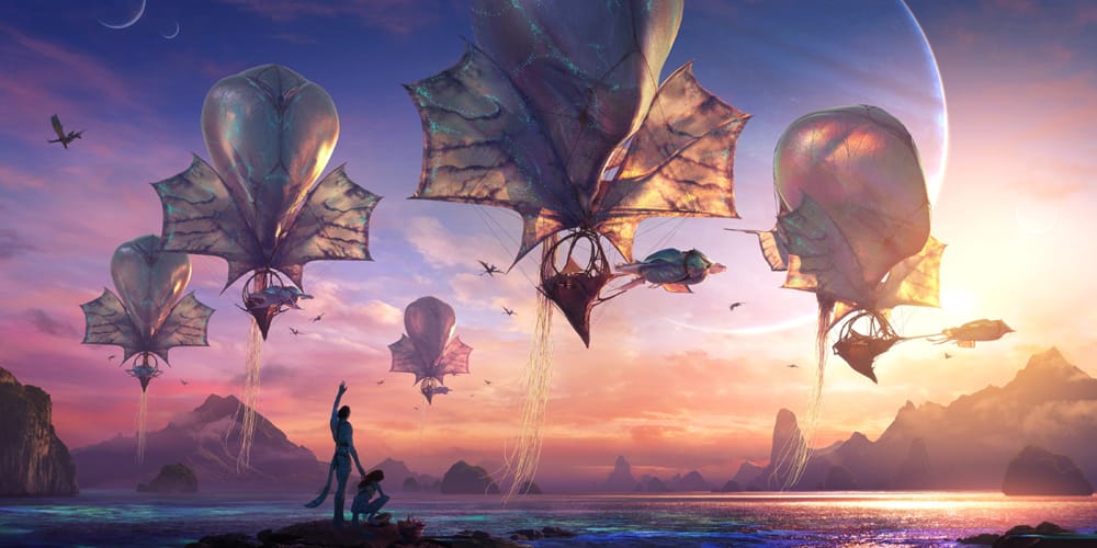 The concept art reveals Wind Traders which are seen soaring amongst amongst the clouds in larger than life corral Pandoran creatures. “hey’re nomadic traders, equivalent to the camel caravans of the Spice Road back in the Middle Ages…Like all Na’vi, they live in a symbiosis with their creatures.” Cameron also teased, “If you’ve got any nautical blood in your veins, you’ll want to be on [their] ship.” Avatar: Fire and Ash is expected to run around three hours and is slated to introduce two new Na’vi tribes, the “Ash People” aka the Mangkwan Clan as well as the potential “Fire Na’vi” tribe.