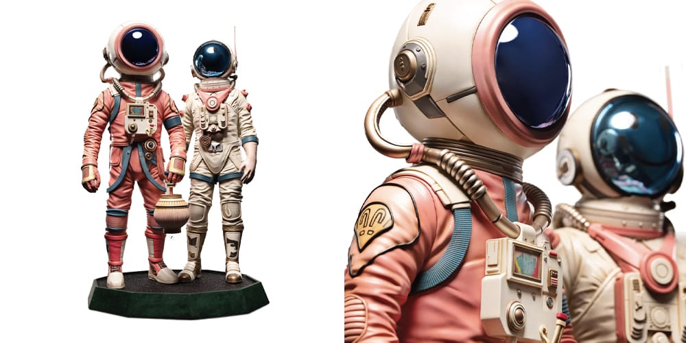 Titled after the fictional celestial body, KEPLER-22B, the toy features a girl-boy astronaut duo donning pink and white spacesuits with embroidered patterns blooming across the panels. The two figures stand, hand-in-hand, with what appears to be a lantern at their center.