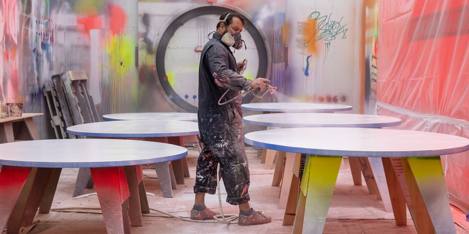 For this new series, REVOK created several instruments that act as extensions of his body. One of which is a metal frame that assists the artist in creating “frame drags” and “tape loops”, along with his signature “spirograph” patterns across a number of assemblage canvases.