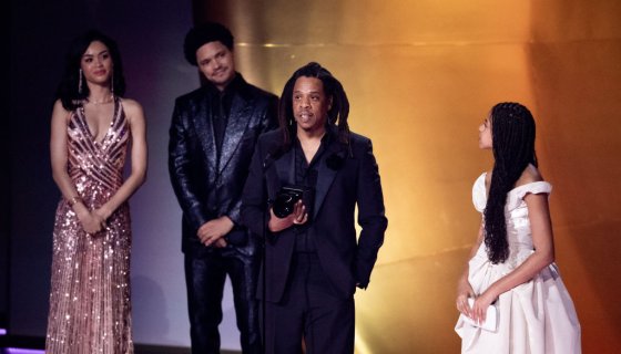 From there, the rapper born Shawn Carter launched into a freewheeling speech where he mentioned Beyoncé, who looked on with a beaming smile, stating that he doesn’t understand how the Academy hasn’t voted for her to win the AOTY Grammy.