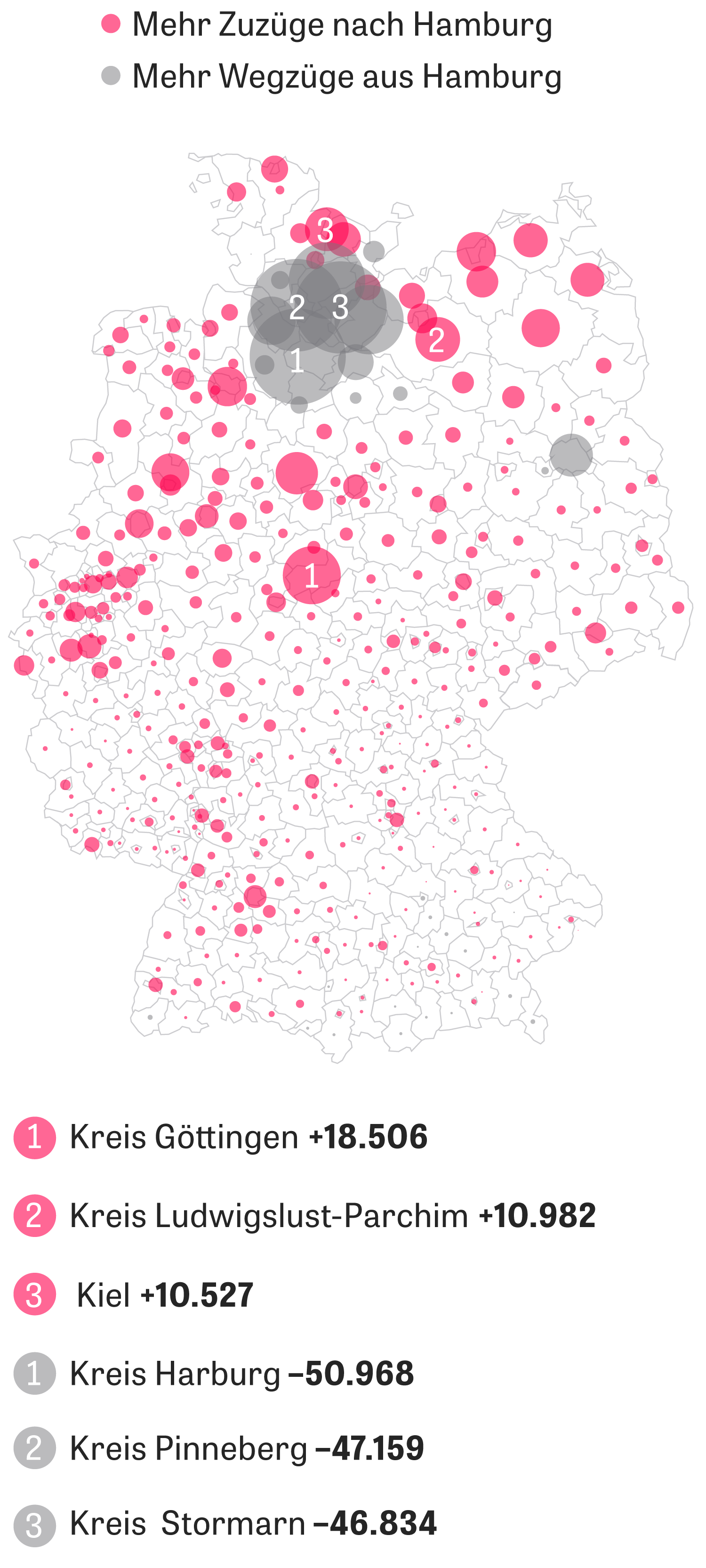 Doch seit diesen Buddenbrooks-Zeiten hat sich Hamburg dramatisch verändert. Ende des 19. Jahrhunderts lebten weniger als eine Million Menschen in der Stadt. Dann stieg die Einwohnerzahl über Nacht, als zum 1. April 1938 die bis dahin eigenständigen Städte Altona, Bergedorf, Harburg und Wandsbek eingemeindet wurden. In Hamburg lebten nun 1,6 Millionen Menschen. Nach dem Zweiten Weltkrieg wurden es noch mehr: Erst kamen in den 1940er-Jahren Flüchtlinge aus Schlesien und Ostpreußen. Ab den 1950er-Jahren wurden sogenannte Gastarbeiter aus Italien, Griechenland und der Türkei geholt, um beim Aufbau der Wirtschaft zu helfen. In den 1990er-Jahren kamen Menschen aus der ehemaligen Sowjetunion und Jugoslawien, später aus Afghanistan, Syrien, der Ukraine. Dazu gibt es einen steten Zustrom aus der deutschen Provinz, die vielen, die in der Großstadt ihr Glück suchen. Von fast überall in Deutschland kommen mehr Menschen nach Hamburg, als aus Hamburg dorthin ziehen – ausgenommen Berlin und das unmittelbare Hamburger Umland (siehe Grafik).