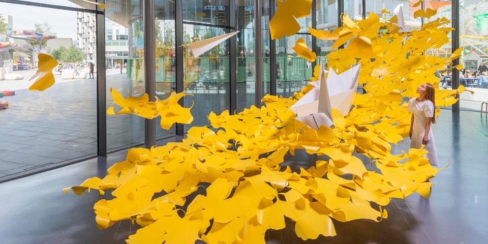 For her latest installation, Lee ventures to London to unveil Maiden Voyage at NOW Gallery. Comprised of a forest of hanging ginkgo leaves, a series of paper airplanes and a paper boat is seen floating through the ethereal presentation. The scenescape draws on her childhood observing the autumn ginkgo leaves in the streets of Korea. Also known as “living fossils,” ginkgo leaves date back over 200 million years and was a way for Lee to convey the passage of time.