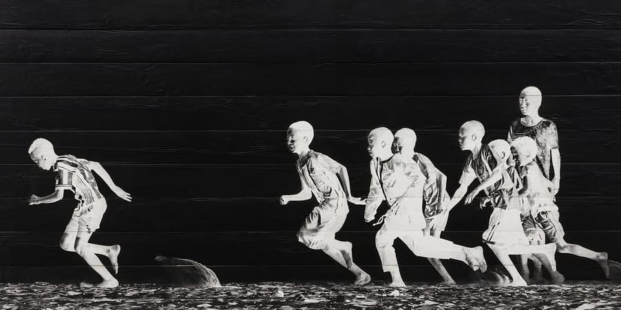 Another key highlight is Les Enfants d’Ouranos (Children of Ouranos), an extension of Déplacé·e·s, also featured in Outposts. The series references Ouranos, the primordial Greek god of the sky, likening JR’s subjects to celestial figures. “Negatives of each photograph are transferred onto reclaimed wood and reinforced with black ink for contrast,” the gallery explains. “The children become glowing silhouettes, evoking classical depictions of divinity.”