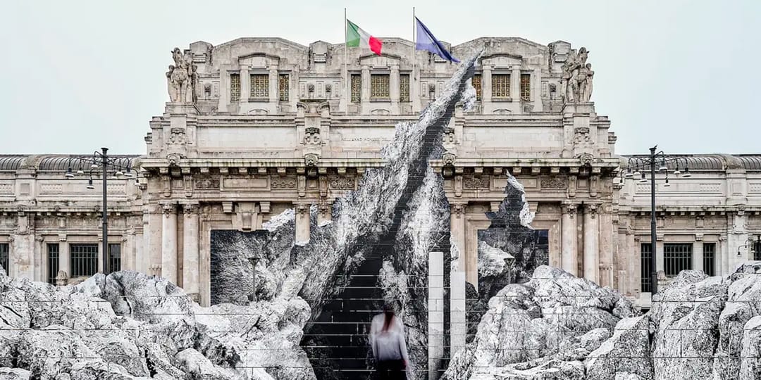 His latest installation features an illusionary trompe l’oeil effect, as a monochromatic depiction of a mountainous terrain forks through the entrance to the train station. “In spaces that have social issues, my work is about bringing people together,” JR told The Art Newspaper. “In a place like this, a huge range of people come to catch the train. When they find themselves in front of an exhibition, they will suddenly have a different kind of interaction.”