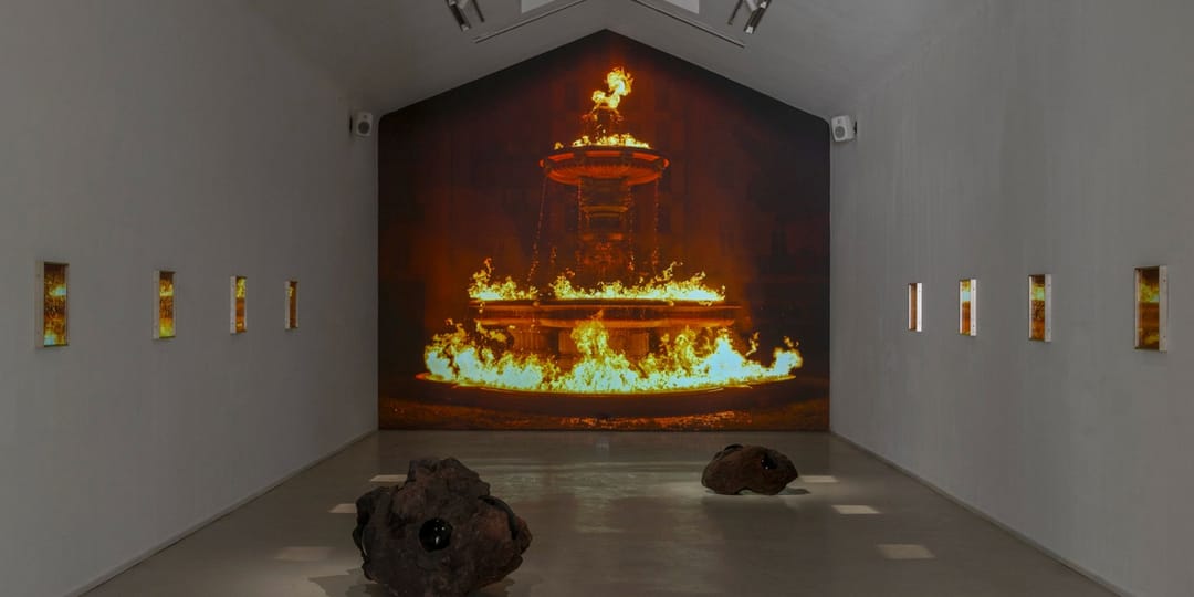 Throughout the history of art and literature, fountains have been used as symbols of life, youth and purification. Walking into Perrotin’s Saint Claude location, Charrière transforms the space into a burning chapel as a film projection shows an opulent fountain ablaze, metaphorically alluding to how Western society was formed through the use of materials that is now turning the planet into a furnace.
