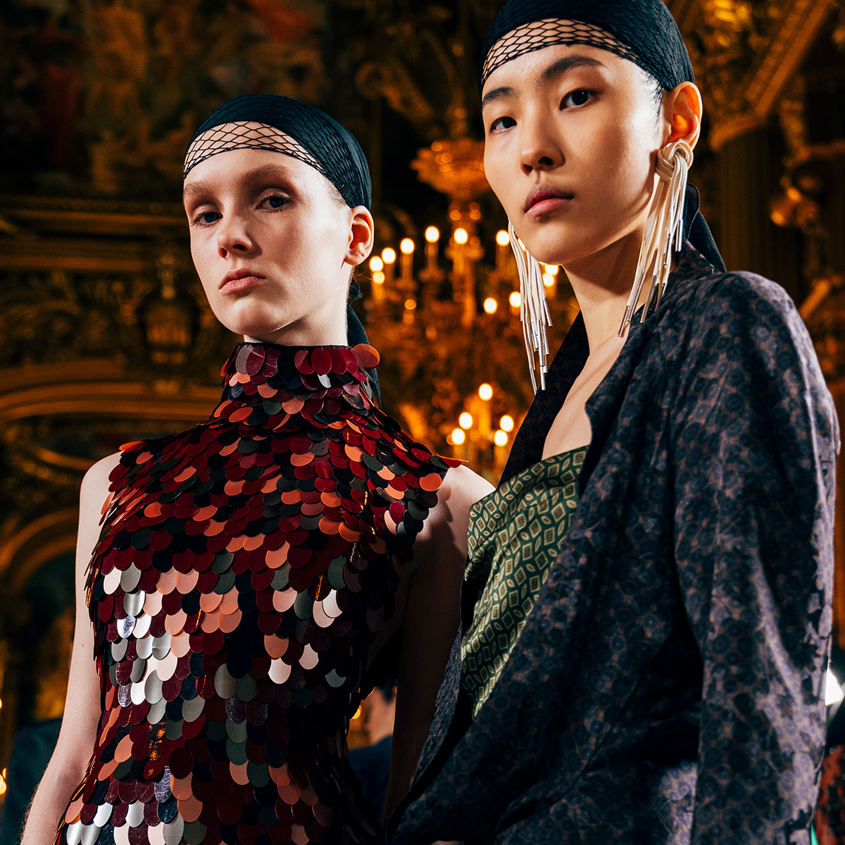 One of the biggest immediate contrasts between old Dries Van Noten and new Dries Van Noten was the look of its show venue. In the past, runway shows have taken place in raw, industrial spaces, where the clothes were the clear centerpieces in the room. Klausner, however, chose a much more lavish locale, welcoming his guests to the Palais Garnier, an opera house that opened in 1875 in the 9th arrondissement in Paris. The space is lavish inside and out, with large chandeliers lighting the catwalk and ornate paintings and architectural features everywhere the eye can see. “The collection was created with the venue in mind,” Klausner wrote in a press release. “I imagined women passing through the opera, grabbing fabrics and objects, tying them with a shoelace while on a quest to find the answer to an unknown question. Behind the curtain, where creation and practice happen.”