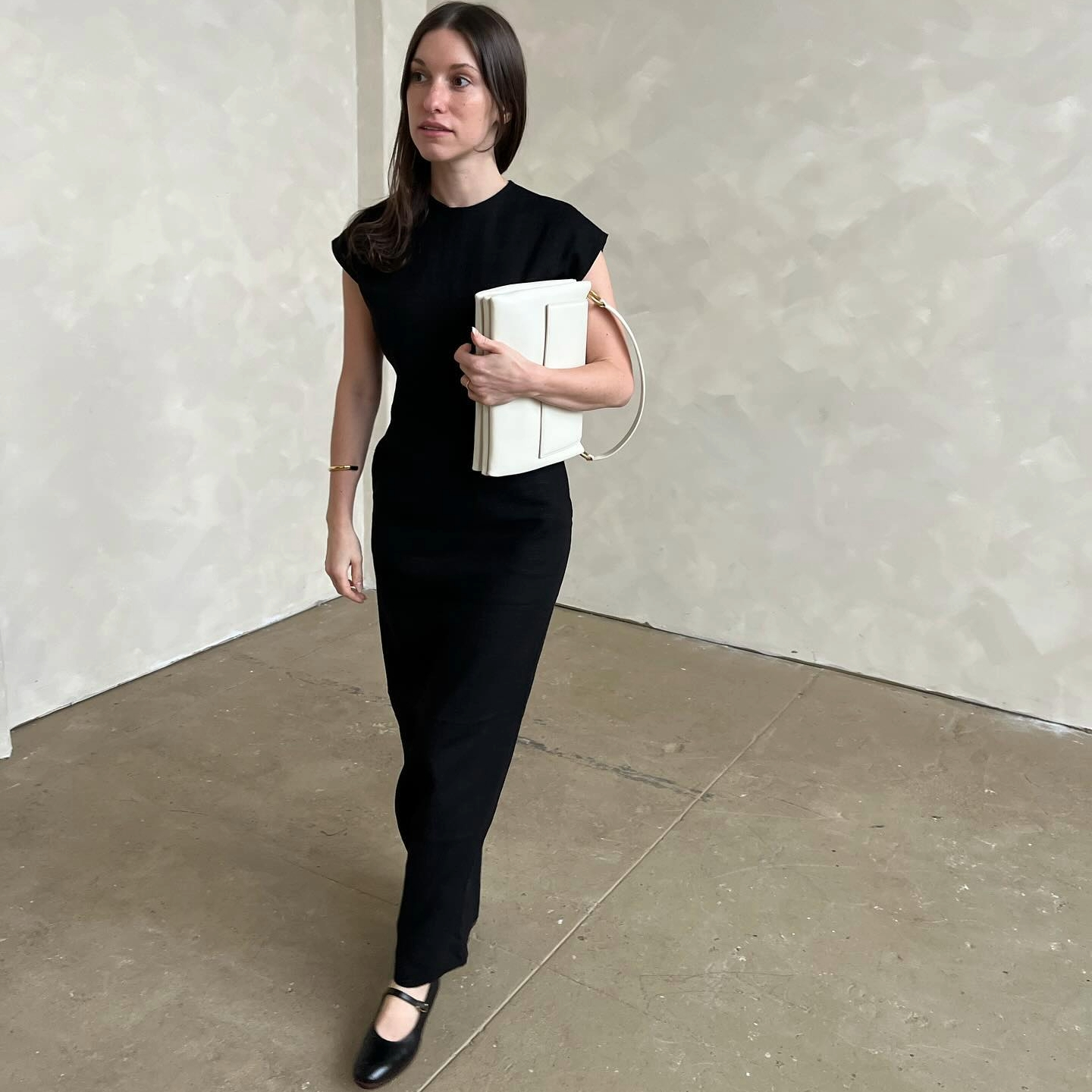 Go gallery chic with a long, black column dress that screams fashion-forward. When paired with black, Mary Jane flats, it’s a match made in heaven. Add equally cool accessories such as a single bangle bracelet and an optic white handbag for a little contrast, and you’re good to go.