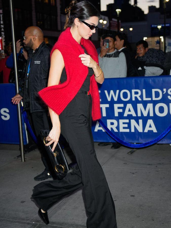Bright shades of red have been trending all over TikTok, and slowly but surely garnering attention amongst the fashion set in form of chic red ballet flats, or a bold red bag. But as we move towards the winter months, I’m looking for something to keep me warm, so it’s all about the knit. Spotted slung over the shoulders of Kendall Jenner out in New York this week, she wore hers with an otherwise entirely black outfit. Jenner’s red knit elevated her look with a dash of colour and flush of texture for an interesting twist on autumn dressing. Styled with pointed-toe heels and a black Gucci Horsebit bag, her cohesive look allowed the crimson shade to pop without overwhelming the outfit.
