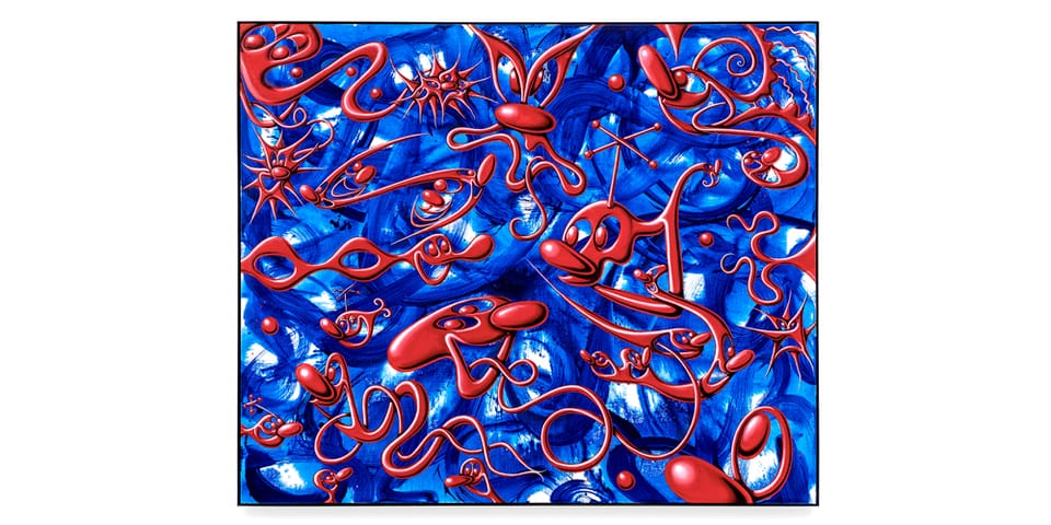I’m Baaack consists of 23 sculptures and paintings, most of them created between 2022 and 2023. As usual, Scharf’s signature color schemes and pop surrealist motifs make a return in this new body of works. In the framed paintings, shiny cartoon-esque figures are decked across brightly-hued bases in various explosion-like spectacles.