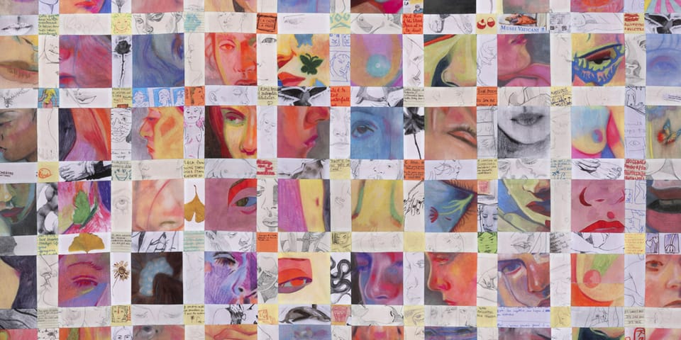 At the core of these transitions are opportunities to question reality and reshape one’s inner world. Chiefly known for her introspective paintings, Longevial taps into the mythology of the phoenix through a large patchwork tapestry made with cut prints and quilted by her grandmother. “Like a phoenix that ignites to be reborn from its ashes, perhaps we are reborn several times from our first adventures. The patchwork of a thousand faces is like an envelope of memory, of all this inferno of the first and last thrill,” said Roche.