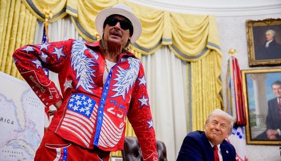 President Donald Trump was joined by musician Kid Rock in the Oval Office, who wore a white straw fedora and a red tracksuit with bedazzled elements such as an eagle’s wings, stars, and the number “250” to mark the country’s 250th anniversary next year.