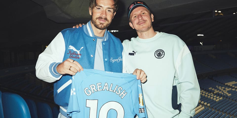 KidSuper’s latest cameo into football sees him showing up at Manchester City, where he designed a 1-of-1 jacket for £100 million GBP man Jack Grealish to celebrate the club’s treble from last season. The varsity-style jacket is crafted in City’s signature sky blue and white colors, with a typical wool body, leather sleeves, snap buttons, ribbed cuffs, waist and necklines. KidSuper Studios embroidery is layered on top of a PUMA logo on the left chest, while “SuperJack” on the right chest in KidSuper script is a cheeky reference to one of Grealish’s nicknames.