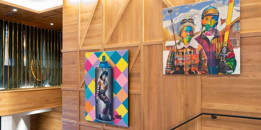 W Aspen in Colorado has become a living canvas for the renowned Brazilian artist Eduardo Kobra, who has transformed the space with a vibrant collection of murals and installations. Known for his kaleidoscopic style of bold colors and geometric patterns, Kobra’s work at W Aspen spans the lobby, rooms, and exclusive guest areas, creating a visual feast that embodies his signature technique. Using interwoven squares, triangles, and textures, Kobra brings larger-than-life portraits to life, celebrating figures and moments through his unmistakable artistic lens.