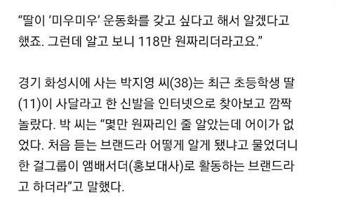 An article in Korean media was reposted to an online forum. The article claimed that a mom had been shocked when her elementary school daughter asked her for Miu Miu sneakers. The mother found out that it was due to an idol ambassador for the brand that caused her daughter to desire the sneakers.