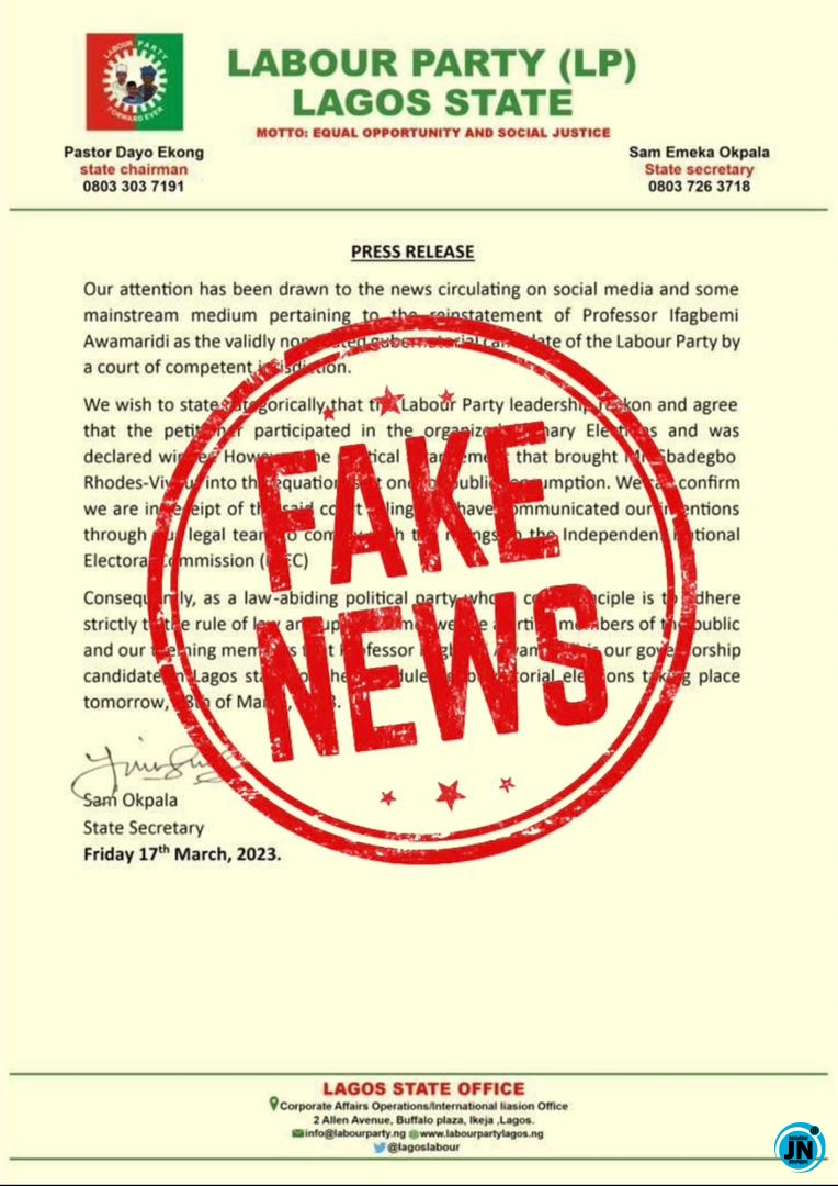 The Labour Party has released a statement denying reports that Professor Ifagbemi Awamaridi is their candidate for the Lagos gubernatorial election. The party clarified that Gbadebo Rhodes-Vivor (GRV) is their official candidate for the governorship race. This comes after circulating reports claimed that Awamaridi accused the Labour Party of submitting a fake withdrawal letter to the Independent National Electoral Commission (INEC) to remove his candidacy, which he denied doing.