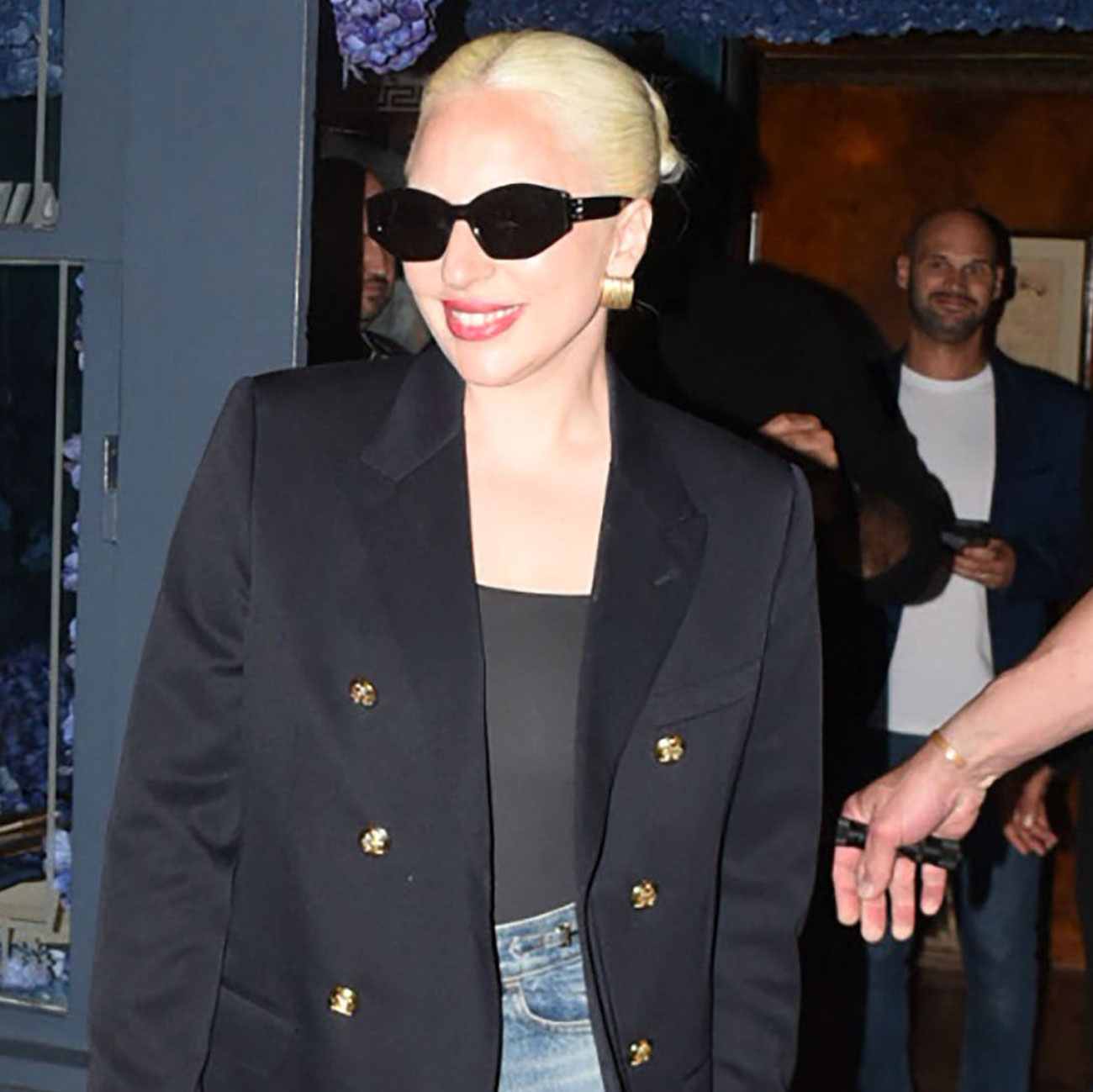 On Lady Gaga: Celine Long Blazer ($3550), Margaret Jeans ($1350), Teen Nino Bag ($3300), and 08 Sunglasses
