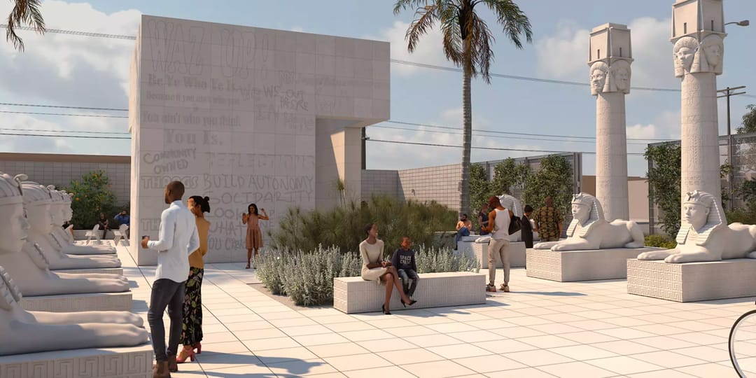 Entitled “sister dreamer, lauren halsey’s architectural ode to tha surge n splurge of south central los angeles,” the temporary sculpture park is curated by Los Angeles Nomadic Division (LAND) co-founder Christine Y. Kim and is supported by the Mellon Foundation’s Monuments Project. From a distance, the park looks like a trip back to Ancient Egypt, as Halsey casts eight sphinxes and eight totemic columns with the head of the Egyptian goddess of beauty, Hathor.