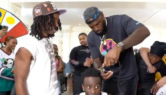 LeBron James, also referred to as LeBarber by Cenat, came through the Mafiathon with his daughter, Zhuri James, and snipped Cenat’s dreadlocks one by one. With the cutting of the last strand of hair, the room erupted dramatically, with Cenat posing with his hair as James mugged in the background.