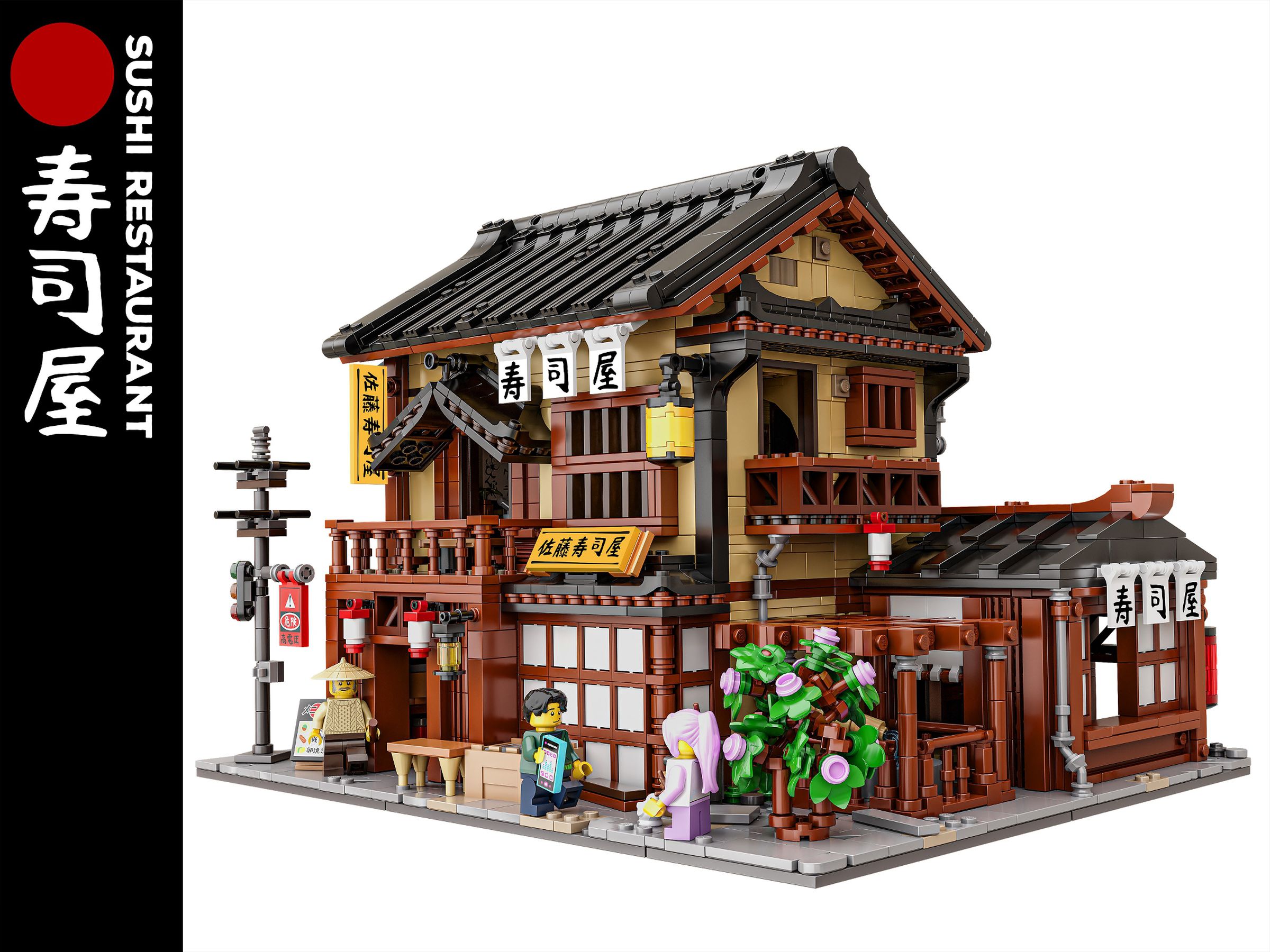 A traditional looking Japanese building made entirely out of Lego, with a fountain, flowers, two stories, entranceways and signs to the Sushi restaurant.