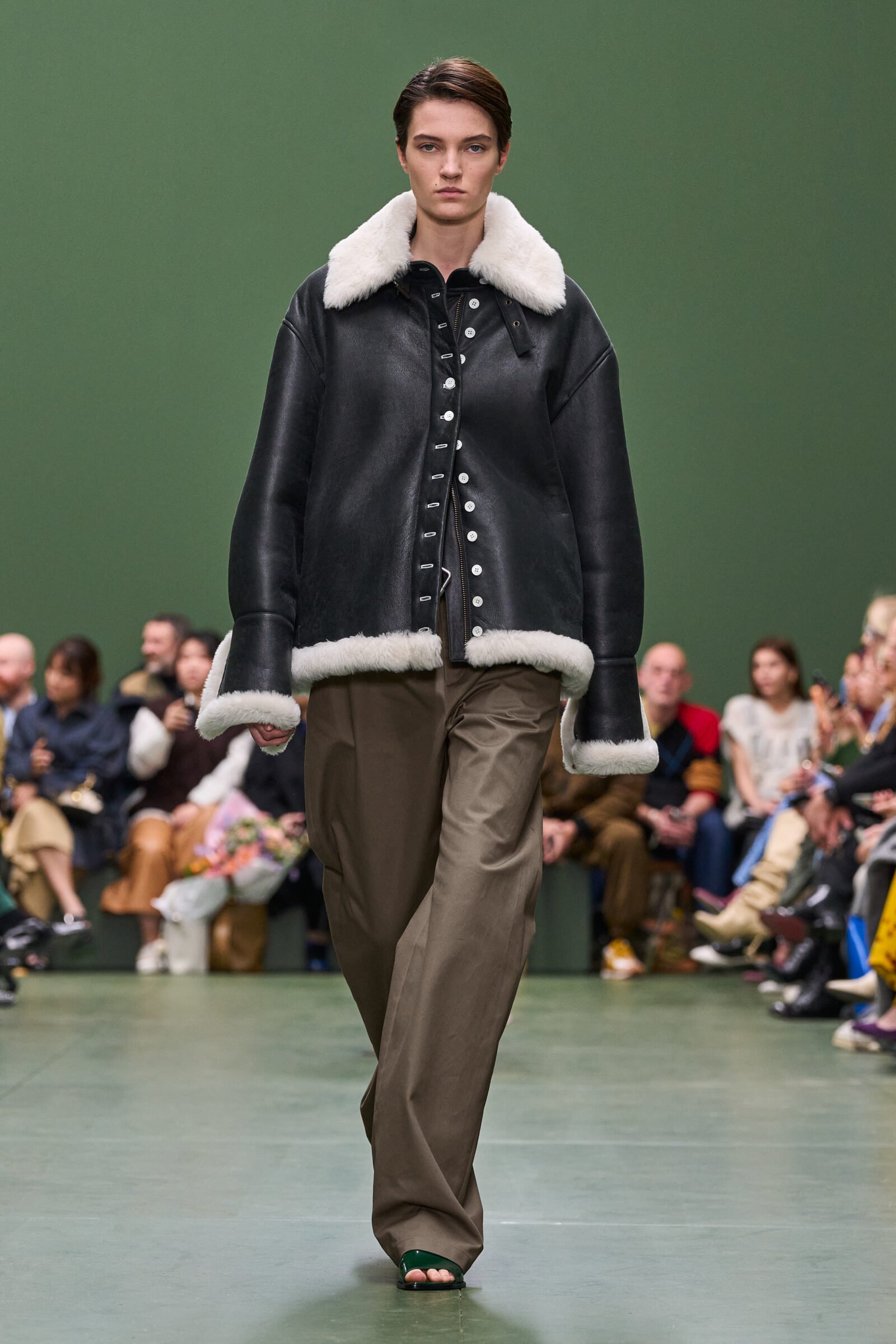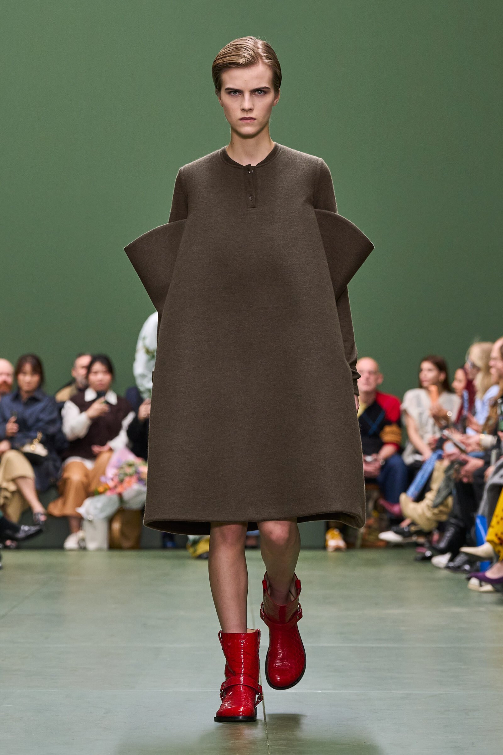 True to LOEWE’s heritage, leather was revered, with draped nappa blousons and aviator jackets making prominent appearances. The Flamenco Purse was reimagined in a new, large size, and prints mesmerized the onlookers by creating illusions of other materials. Buckles weren’t just fasteners but ornaments adorning clothing and accessories, including the biker boots and Squeeze bags.