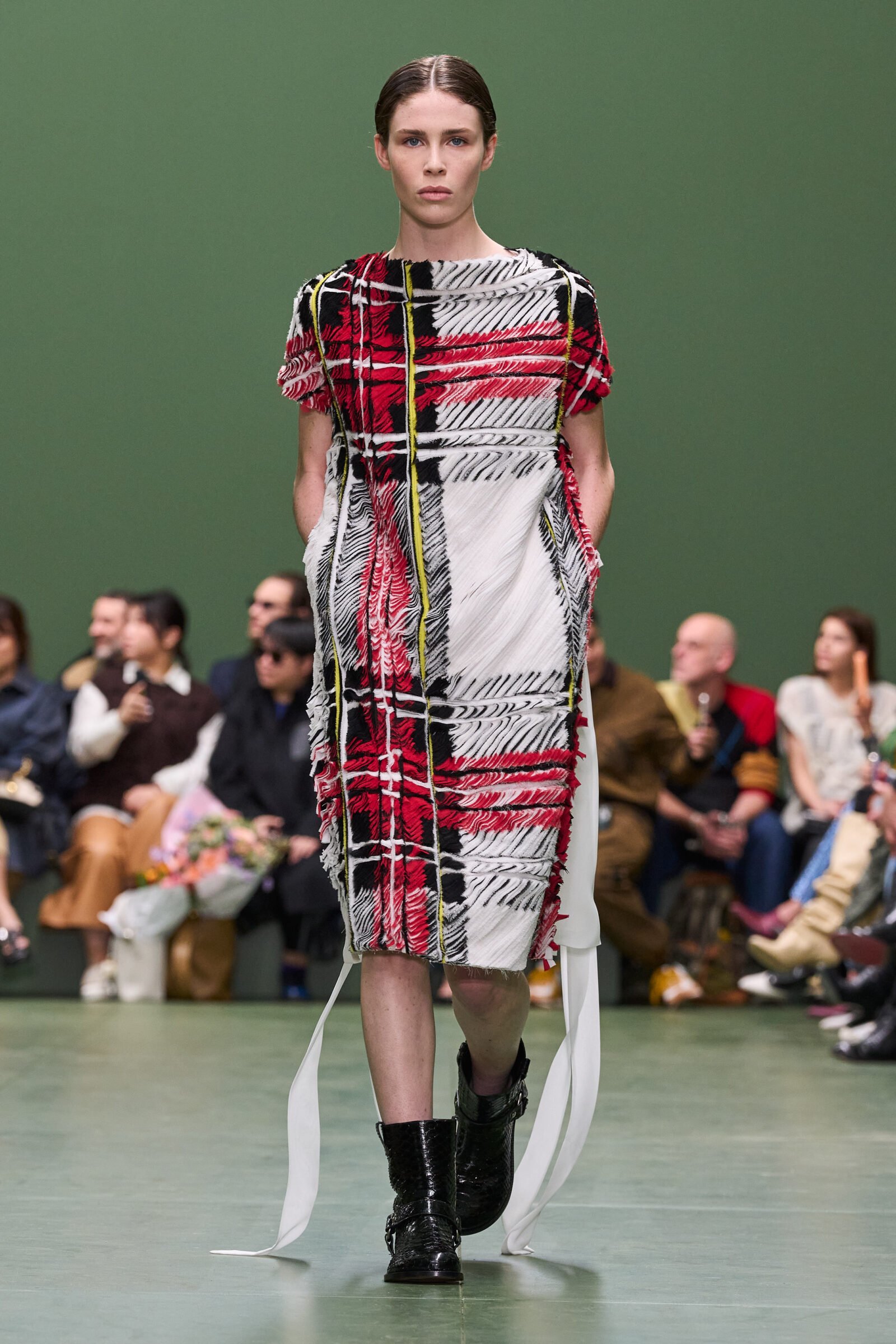 Prints in the collection bore a tactile quality, with tartans reimagined in mille-feuille chiffon layers, enhancing their three-dimensional effect. The garments weren’t mere articles of clothing; they were presences, embodying the moment and echoing Albert York’s sentiment that the real paradise is the one we inhabit.