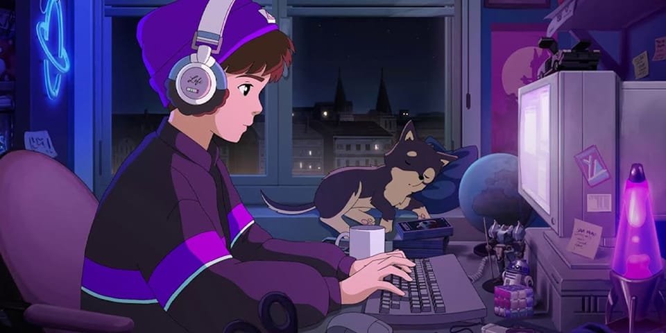 The channel is officially titled “Synthwave – beats to chill/game to,” and the unnamed character is currently referred to by the community as “Synthwave Boy” or “Lofi Boy.” Planted at his desk with his left side facing the window, the character is seen in his room typing on the mechanical keyboard next to a Saturn-shaped neon sign, a lava lamp, and his dog. As part of the storyline, a faint blue window can be seen from the original Lofi Girl stream which has been revealed as the room of “Synthwave Boy.” Likewise, the outline of her room can be seen from his window. The disappearance is interpreted as the two neighbors taking time to meet up.