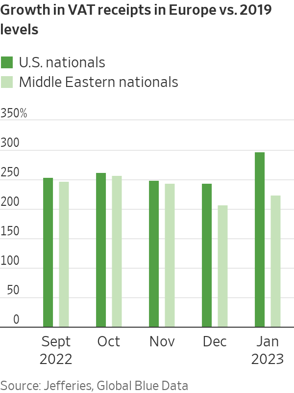 That means London is missing out on a spending boom by wealthy American and Middle Eastern tourists that began last summer and has benefited big cities on the European continent, mainly Paris and Milan. In January, VAT receipts from Middle Eastern visitors to continental Europe, a good proxy for luxury spending, were up 224% compared with the same month of 2019, based on data from tax refund company Global Blue.