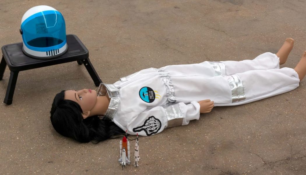 To supplement the fragment comprises of painting, sculpture and multi-media installations that probe into the contemporary moment in relation to the postmodern question. Standouts within the show include Elliot Hundley‘s Night (2021), a large-scale work made of materials such as encaustic paper, plastics and photo fragments that are pinned together in a mélange of iconography, periods and cultural touch-points. Whereas, American artist John Miller bypasses the abstract in favor of a mannequin female figure, clad in a space suit — and a skull patch giving off the bird — as it lifelessly looks up to the heavens, surrounded by smaller space figurines.