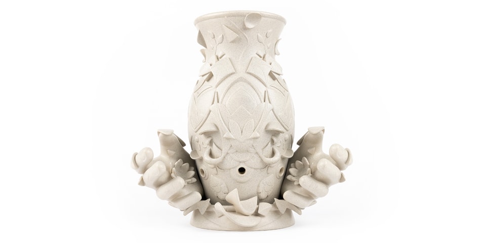 Part artwork, incense holder and flower vase, the multi-functional sculpture features geometric shards that swarm around the object and a floating set of hands.