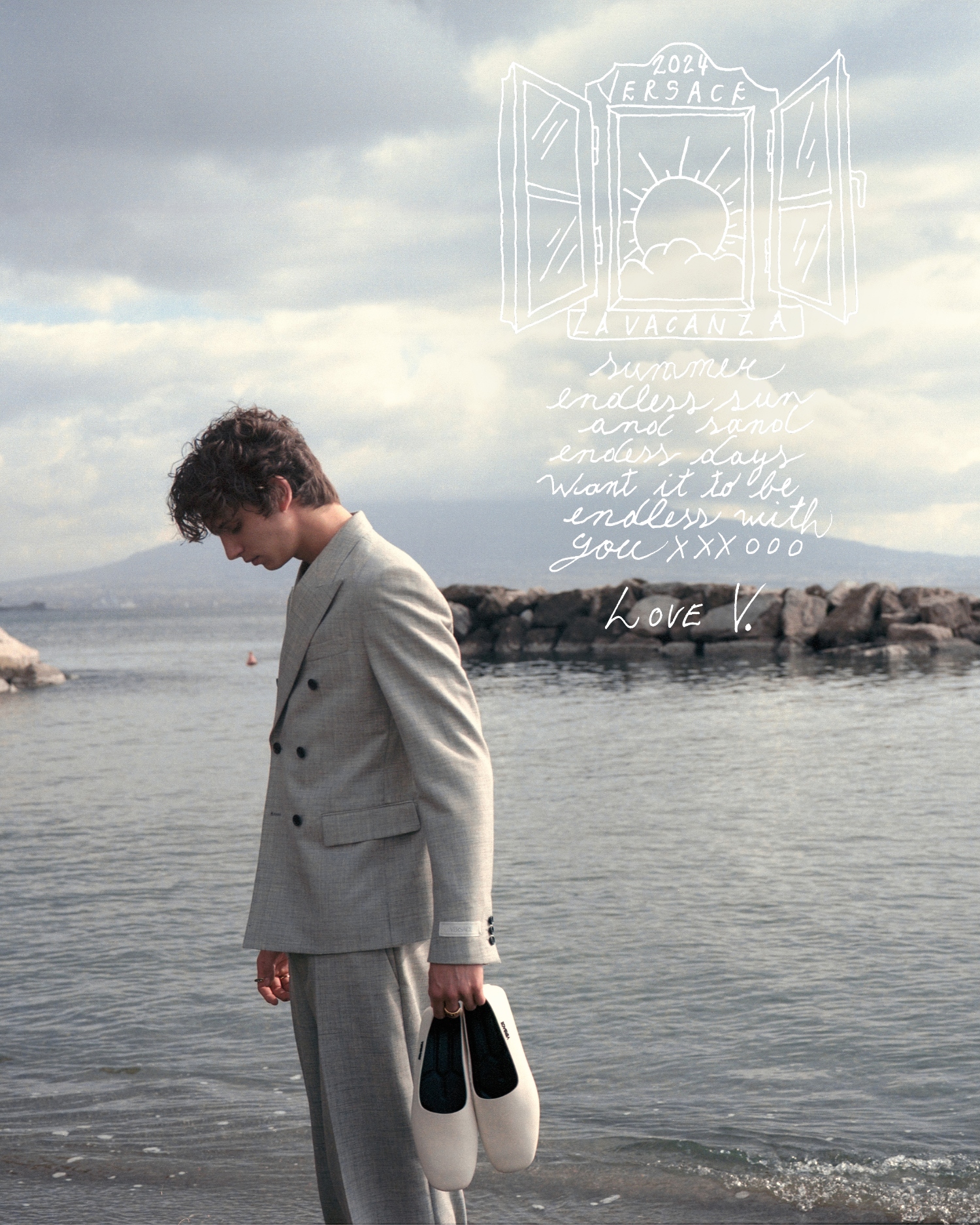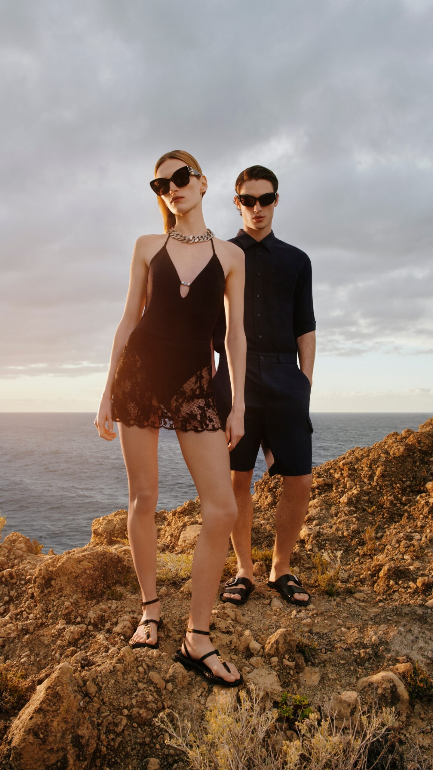 Aimed at “sunrise to sunset dressing”, Donatella Versace’s latest “La Vacanza” collection is described by the brand as a celebration of graphic prints translated through the generous use of summer silks, satin, and jersey. The collection sees a new graphic dubbed the “Barocco Sea” print which is inspired by natural wonders of the sea. The graphic is explored in different colour combinations and material techniques across women’s and men’s shirts and matching shorts, summer knit cardigans and bracelets, a full selection of dresses and jersey skirts. Tweed jackets, tops, skirts, and shorts are revisited from recent seasons, this time in lighter fabrics and in shades of dusty rose and ivory. New pleated dresses with lavallière details and the Barocco print are also in colours of dusty rose, beige, or concrete blue. Standout evening styles include a cocktail dress in Versace’s iconic metal mesh, and a column gown with starfish shapes crafted in embroidery of Japanese natural pearls, silver paillette, and crystals.