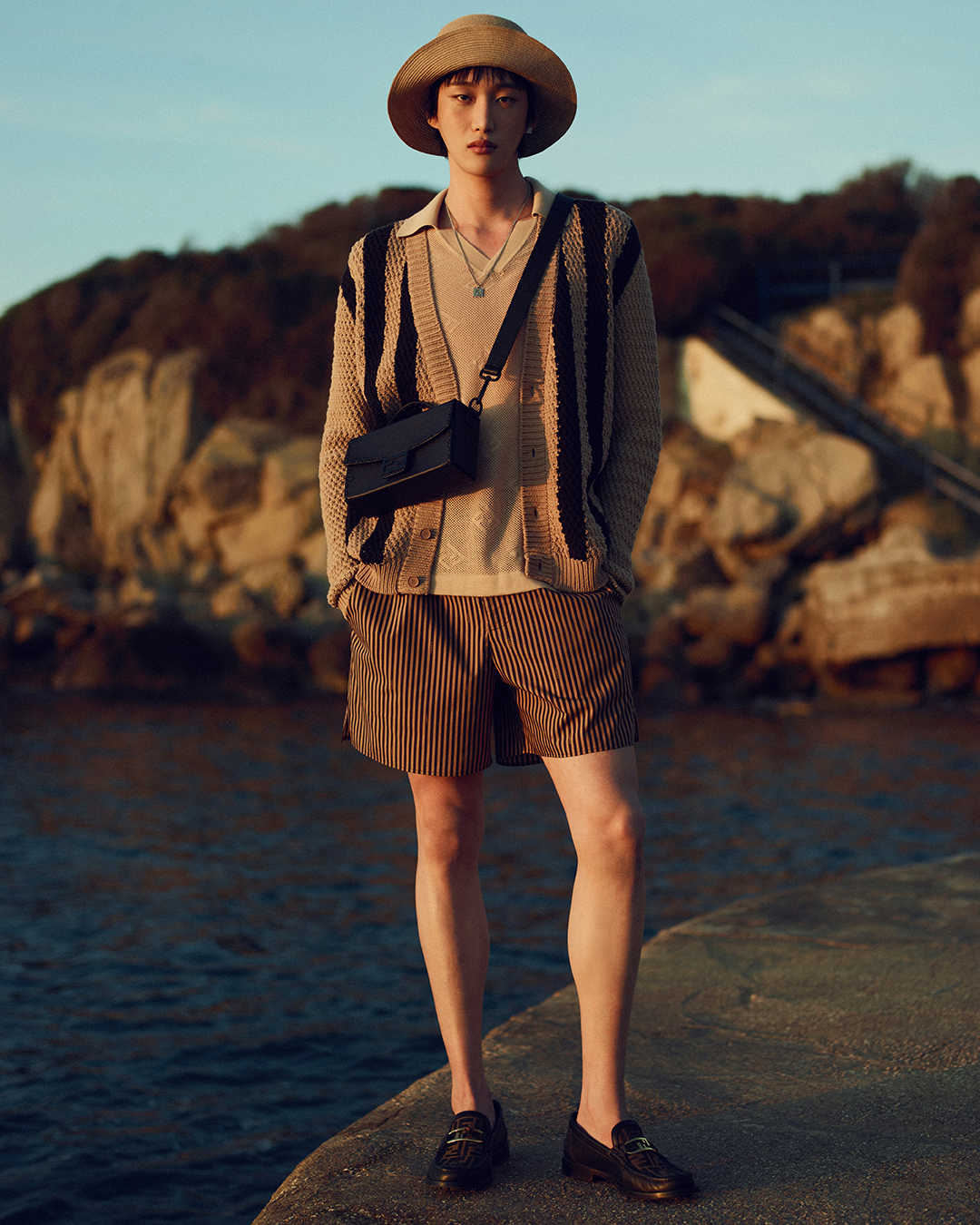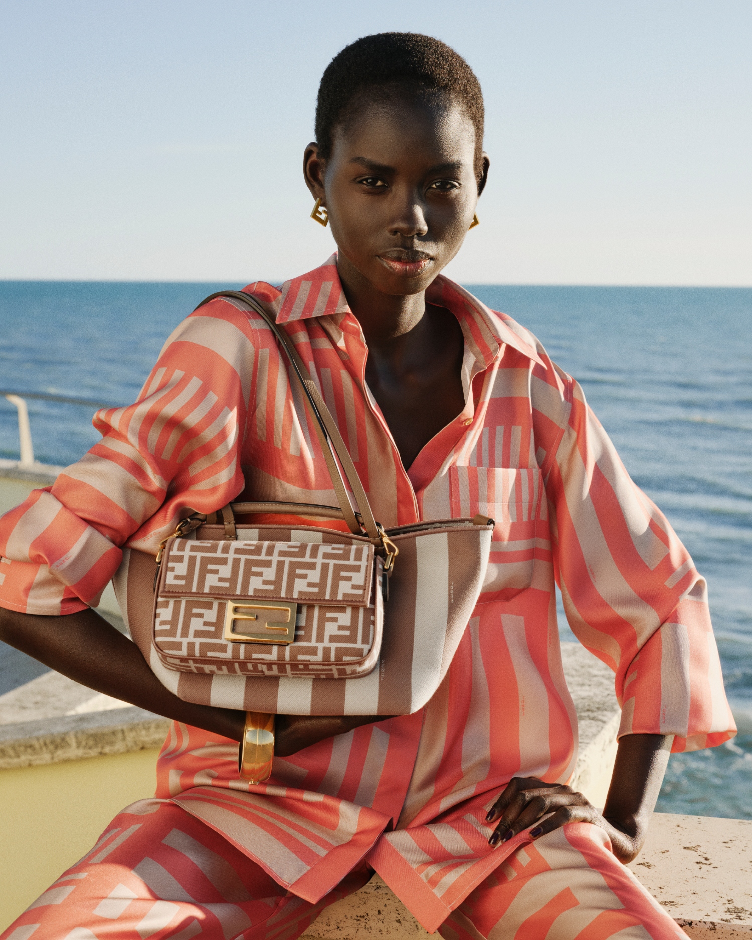 Fendi’s Summer 2024 collection evokes a sense of duality and echoes the Maison women’s spring/summer 2024 show by Kim Jones with an expansion on the elegant practicality of its pieces. The collection emphasises the idea of Roman freedom against the joyful backdrops of both the city and the seaside. The colour palette sees a series of pale blues, vivid red, bright yellow and contrasting neutral ensembles. The collection also recalls the signature Pequin motif (the black and tobacco vertical “logo no logo” pattern). From outerwear to beachwear, the Pequin is applied on the womenswear range with a contemporary twist, as seen on a leather jacket. The same effect is reflected in the menswear line-up, where the Pequin is spread onto estival materials, from sponge to cotton and crochet.