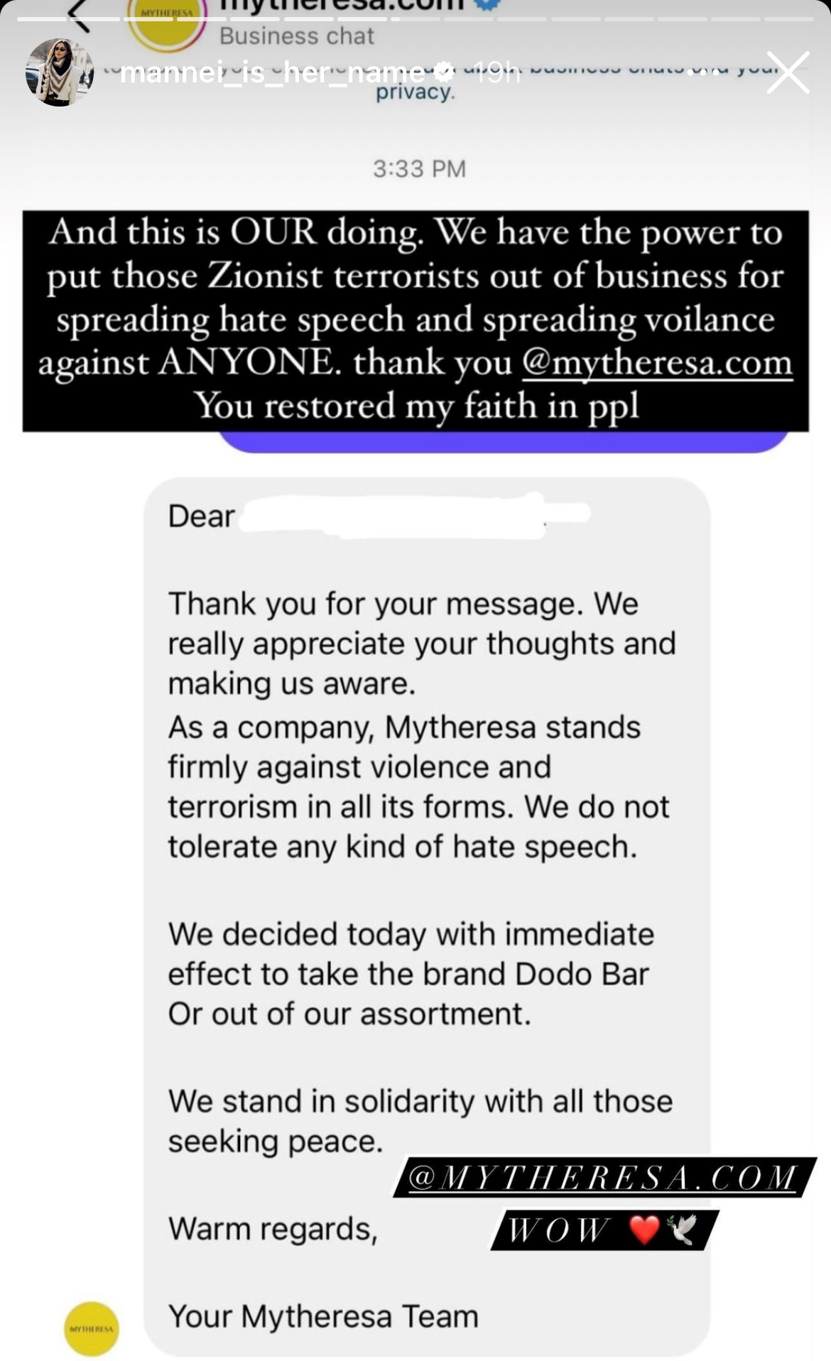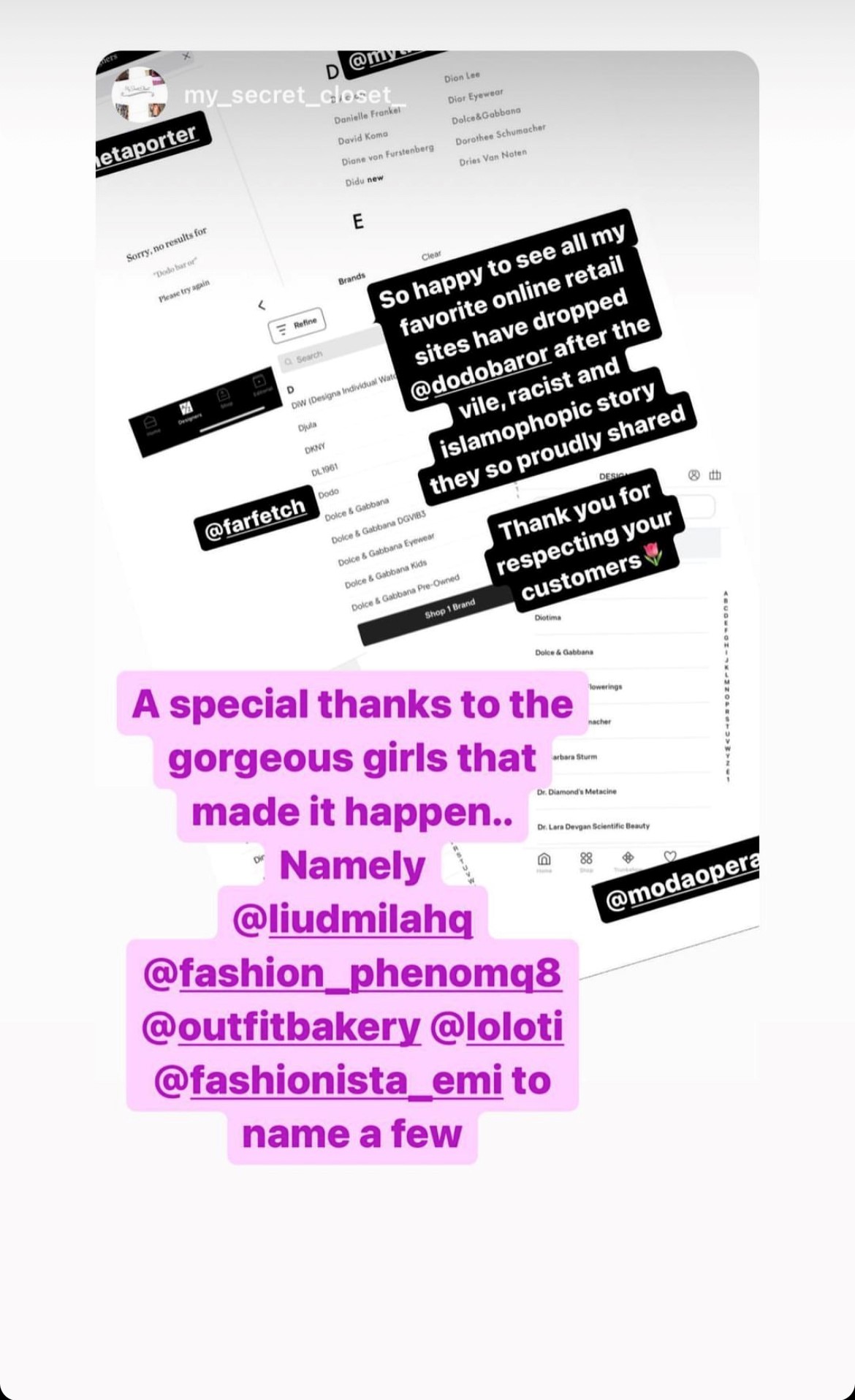 Influencer @liudmilahq messaged MyTheresa on Instagram calling for the boycott against Dodo Bar Or’s products.