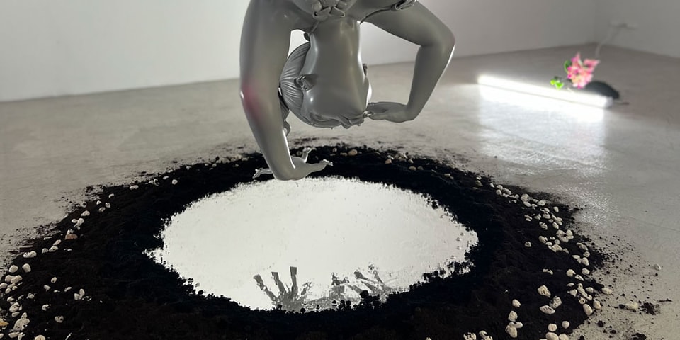 Entitled “Moratorium,” the presentation features a striking 3D-printed sculptural installation of an anime-inspired female subject that is dangling from the ceiling and whimsically gazing into a mirror below that is outlined by earthly materials. The figure is clad in a lace bra and panties with her guts splayed and words carved onto her back. Accompanying the sculpture is a series of drawings that are seemingly studies for the artist’s three-dimensional creations that also highlight racy female characters in horrific yet cutesy fashion.