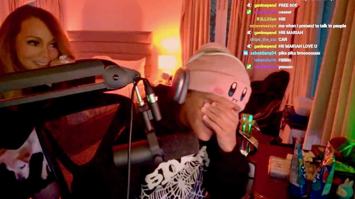 “They’re saying ‘Hi Mariah, I love you’–oh my God,” Rocky grimaced, with his head in his hands, as the chat overflowed with Lambs trying to get her attention. His friends on the stream were more amused, saying hello to the Songbird Supreme (“Hi Mrs. Carey!” one said), and Rocky then blew his cool. “Get out of my room!”