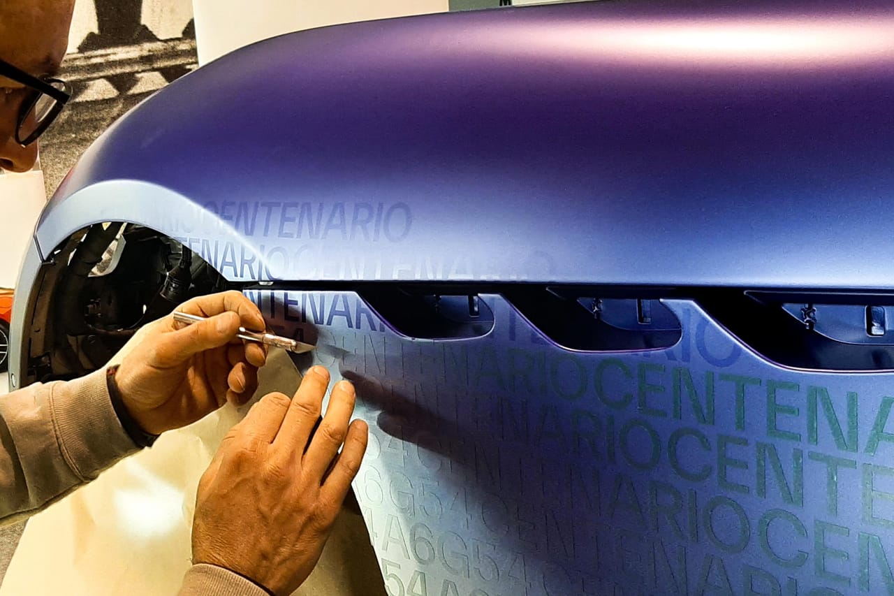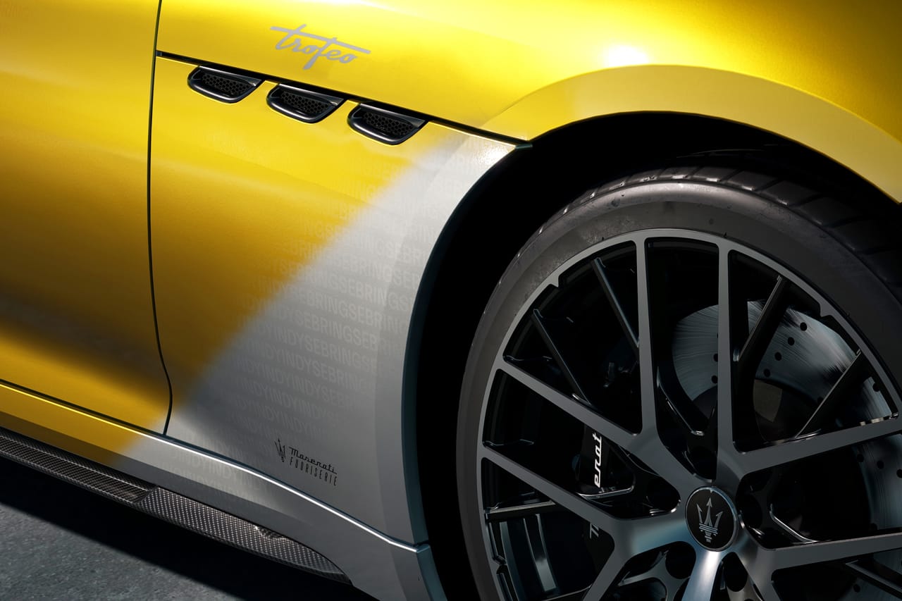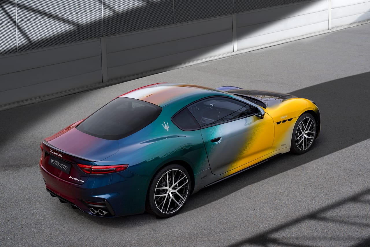 The new-age GranTurismo is accompanied by two one-off car art pieces that are mastered by the brand’s head of design Klaus Busse. Taking its name from the distinctive prismatic orientation of color, the GranTurismo One-off Prisma displays 12 shades deriving from Maserati’s most iconic past cars and two more that look ahead to the future of the brand. Continuing to pay tribute to its heritage, the Prisma features 8,500 hand-applied letter embellishments that make up the various names and sought-after editions amongst the bursts of color.
