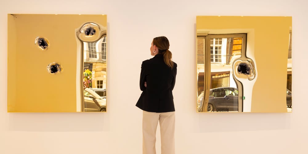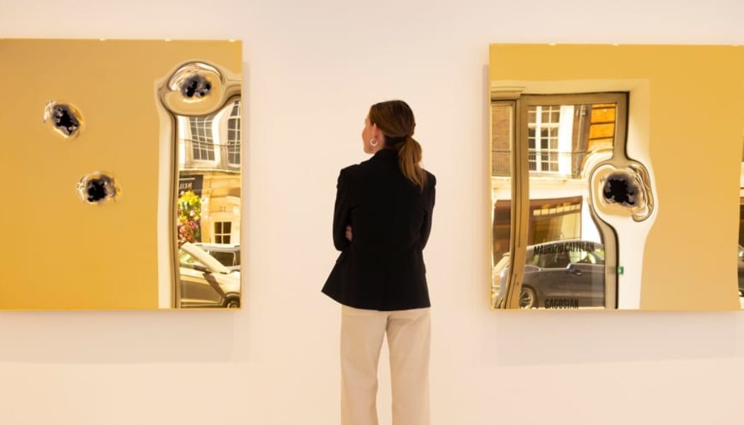 Now on view at Gagosian London, Bones features a series of 24K gold-plated panels riddled with bullet holes. The gallery describes the damaged surfaces as “metaphors for creation and destruction,” exploring the uneasy relationship between material wealth and the widespread availability of deadly weapons. Although not emphasized, the gallery hints that those who purchase a work are able to melt down and reuse the gold, pushing Cattelan’s commentary on affluence even further.