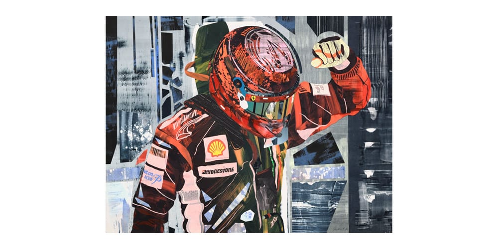 The collages spotlight iconic F1 moments, like Lewis Hamilton’s first Grand Prix win in “Global Player” and the fiery crash between Fernando Alonso and Charles Leclerc in “Moving Through Time” and “Space.” Instead of focusing on facial features, Kagan uses bold colors and sponsor logos to portray drivers like Kimi Räikkönen and Fernando Alonso, elevating them to near-mythical, superhero-like figures.
