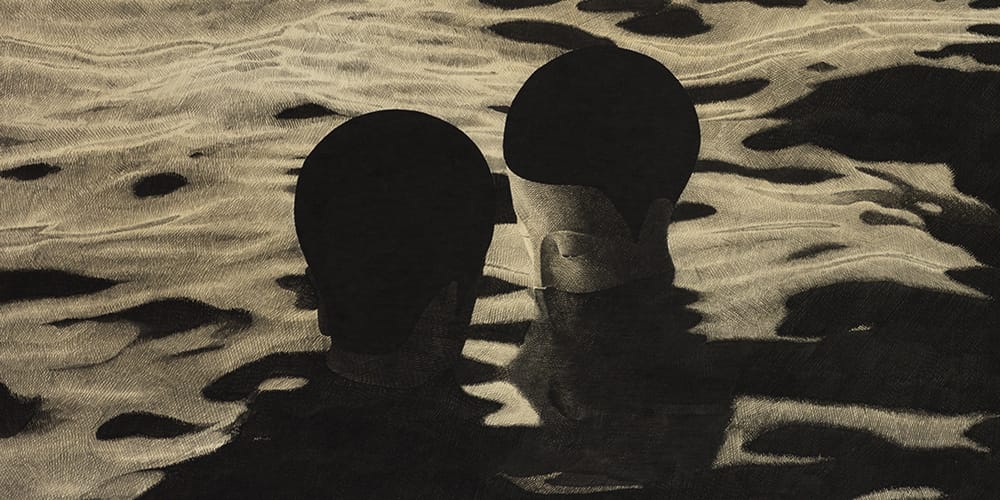 The title borrows from the phrase “찰랑 찰랑 (challangchallang)”, often used to describe the smooth surface of rippling water. Vast lakes add to the surreal scenery and internal worlds echo in gentle waves. As hands and faces seem to emit a soft glow, the figures’ feelings reflect and ripple in the water around them.