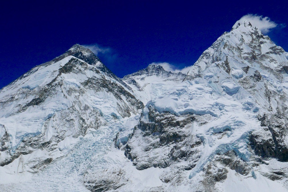 The Everest massif includes Lhotse (centre), the impressive Nuptse ridge (right) and Mount Everest itself (left). Lhotse and Everest can be climbed together as part of a “combo climb”. The routes follow the Khumbu Icefall up to camp four where they part.