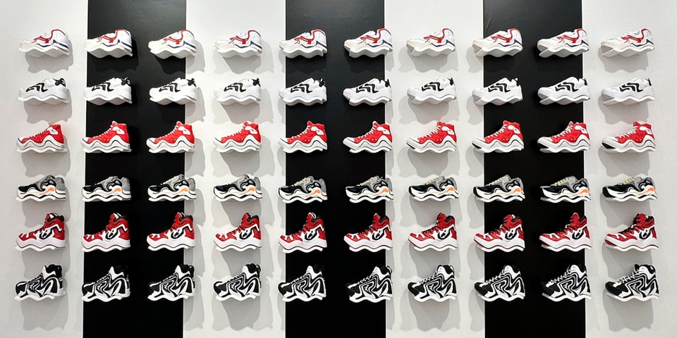 Elsewhere in the faux strip mall, the gallery begins to look like a Foot Locker, where six sneakers adorn the black-and-white striped walls. Upon closer glance, each shoe — some of which resemble a Converse Chuck Taylor All-Star and an Air Jordan 1 — are sublimated to wavy proportions — an act that first started with a Vans Old Skool skate shoe, which led to Vans suing MSCHF in an ongoing suit in the United States Court of Appeals for the Second Circuit.