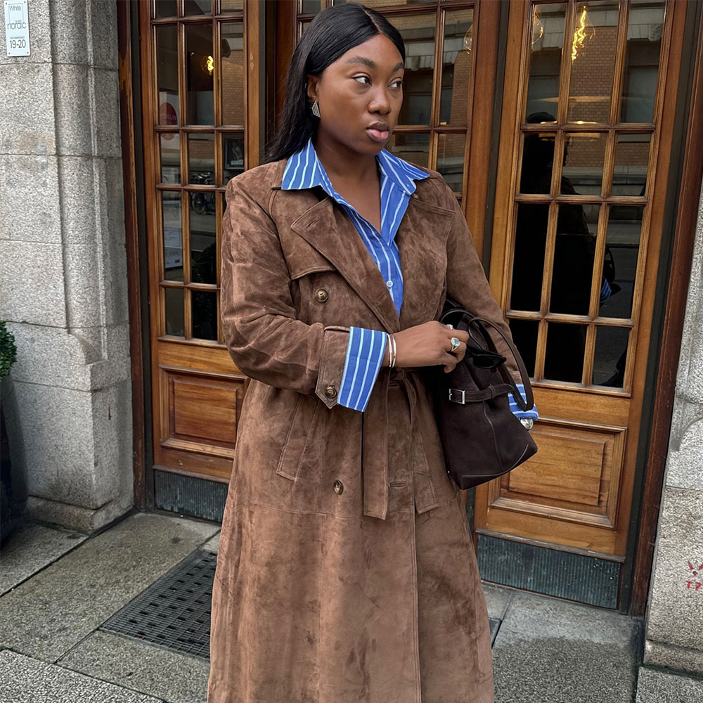 Below you’ll uncover the pieces I sent her (the first 10 pieces below) that feel modern, cool, elevated, and yes chic. I also rounded up more from each brand for further shopping inspiration. You’ll find everything from dreamy outerwear (ahem, like the suede trench above) to wear-everywhere sweaters to the best of the best jeans.