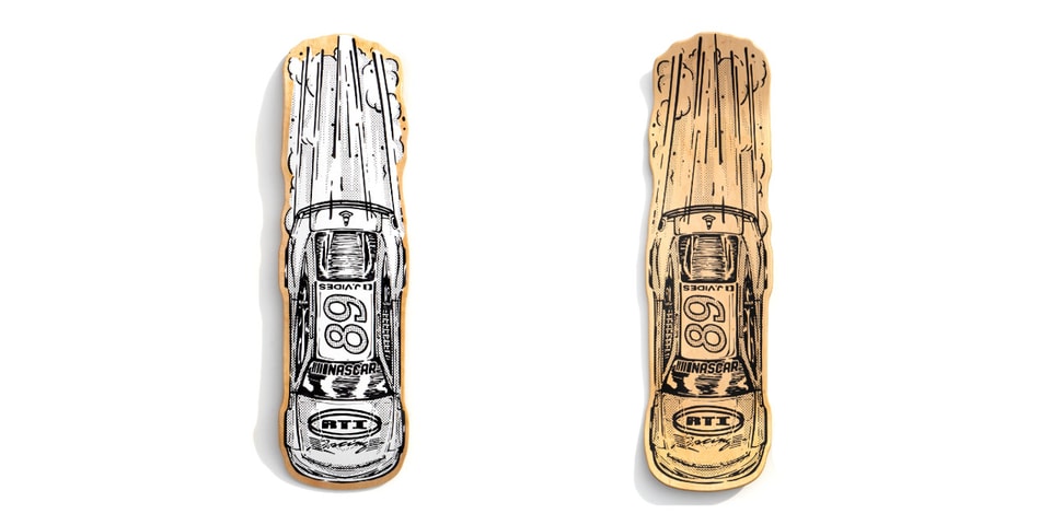 The lineup also includes two custom skate decks. The former enlists a signature black-and-white illustration from Vides, which depicts a dual-stamped racecar atop a carved, wooden board. The latter utilizes the same graphic but without any white coloring.
