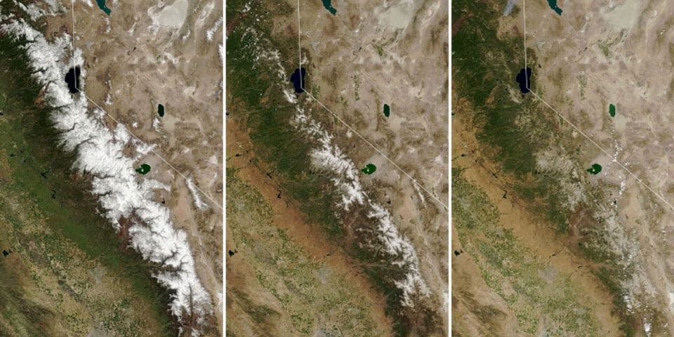 Images taken by Moderate Resolution Imaging Spectroradiometer on NASA’s Terra satellite depict the progression of melting snow in the Sierra Nevada, where snow has completely melted almost a month ahead of schedule after a below-average snowfall season. The rapid melt, which the space agency photographed on March 31, May 18, and July 7 when the snow had fully vanished, has left reservoirs without their necessary water supply for the drier months in summer and fall.