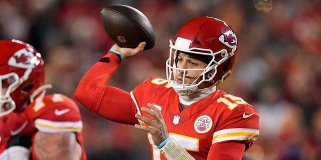 Kansas City Chiefs quarterback Patrick Mahomes (15) throws a pass during the first half of an NFL divisional round playoff football game against the Buffalo Bills, Sunday, Jan. 23, 2022, in Kansas City, Mo. (AP Photo/Charlie Riedel)