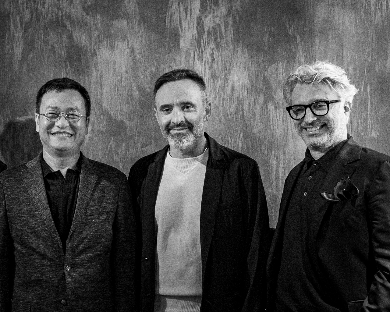 From left: NHN Commerce CEO Lee Yoon-sik, Ikonic founder Maurizio Coltorti and Ikonic CEO Riccardo Bilancioni pose for a photo after the signing ceremony for NHN Commerce’s acquisition of Ikonic. (NHN Commerce)