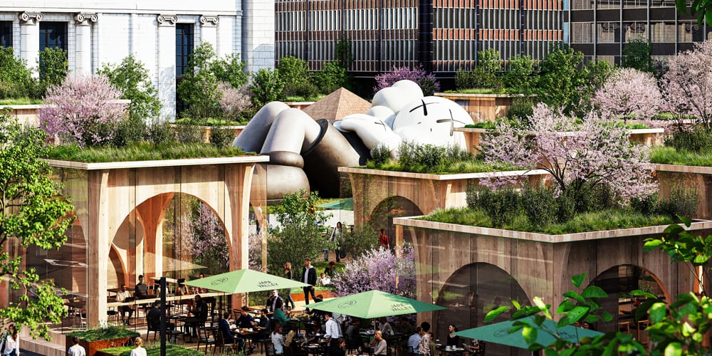 Concept renderings tease a maze of arched, timber-clad structures, complete with lush roofing and floor-to-ceiling windows for sunny interiors. At the center of the lies a reclining COMPANION sculpture by KAWS, anchoring the hectare-sized site with a sense of wonder and play. The New York-based artist was also tapped to curate artworks for NIGO’s cliffside NOT A HOTEL home last year.