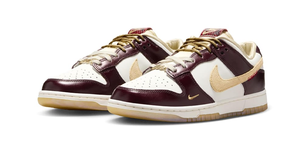 Notes: Nike has unveiled another Dunk Low offering for Lunar New Year 2025. This women’s exclusive “Year of the Snake” model is built with a white leather base and contrasting patent leather overlays in a deep cherry hue. Gold suede lands on the panel swoosh, which is also fitted with red stitching, while additional branding can be found on the mini lateral check, insoles, snakeskin tongue tag and embroidered Nike heel logo. The sneaker then rests on a white midsole and Gum outsole, while flat white and gold rope laces with eye-catching gold dubraes tie the iteration together for a clean finish.