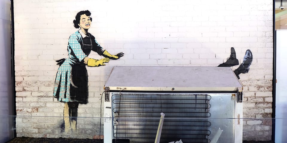 Banksy‘s Valentine’s Day Mascara mural is being sold back to the public. Not in an auction setting, however, but rather through a fractional ownership platform where potential bidders can pay $153 USD per share. The mural depicts a 1950s-style housewife who has a black eye and a missing tooth, as she sweeps up a man (only present by his shoes wailing in the air) into an open chest freezer, as a commentary on domestic violence.